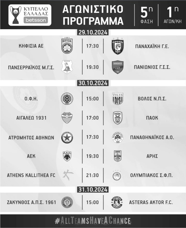 Στην ιστοσελίδα της Ελληνικής ποδοσφαιρικής ομοσπονδίας (Ε.Π.Ο.) αναρτήθηκε το αναλυτικό πρόγραμμα των αγώνων της 1ης αγωνιστικής (πρώτοι αγώνες), της 5ης (Ε’) φάσης, των “16”, του “Κυπέλλου Ελλάδας betsson” της σεζόν 2024-2025!