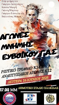 «Σας προσκαλούμε στους Αγώνες Μνήμης του ΕΥΒΟΙΚΟΥ Γ.Α.Σ, και στο ριπτικό τρίαθλο Κ14 που διοργανώνει ο Σύλλογος μας σε συνεργασία με την ΕΑΣ Ανατολικής Εύβοιας και τον Δήμο Χαλκιδέων, στο Δημοτικό Στάδιο Χαλκίδας τη Δευτέρα 16/6/25 και ώρα 17:00. Ο αγώνας αυτός θα είναι αφιερωμένος στην μνήμη των αθλητών στίβου, Γιώργου Δεληγιάννη, Κώστα Μακρή, Γιάννη Μαρίνου, Γιώργου Γιαννέλη και Μακρή Βαλεντίνας. Η παρουσία σας θα μας τιμήσει ιδιαίτερα».