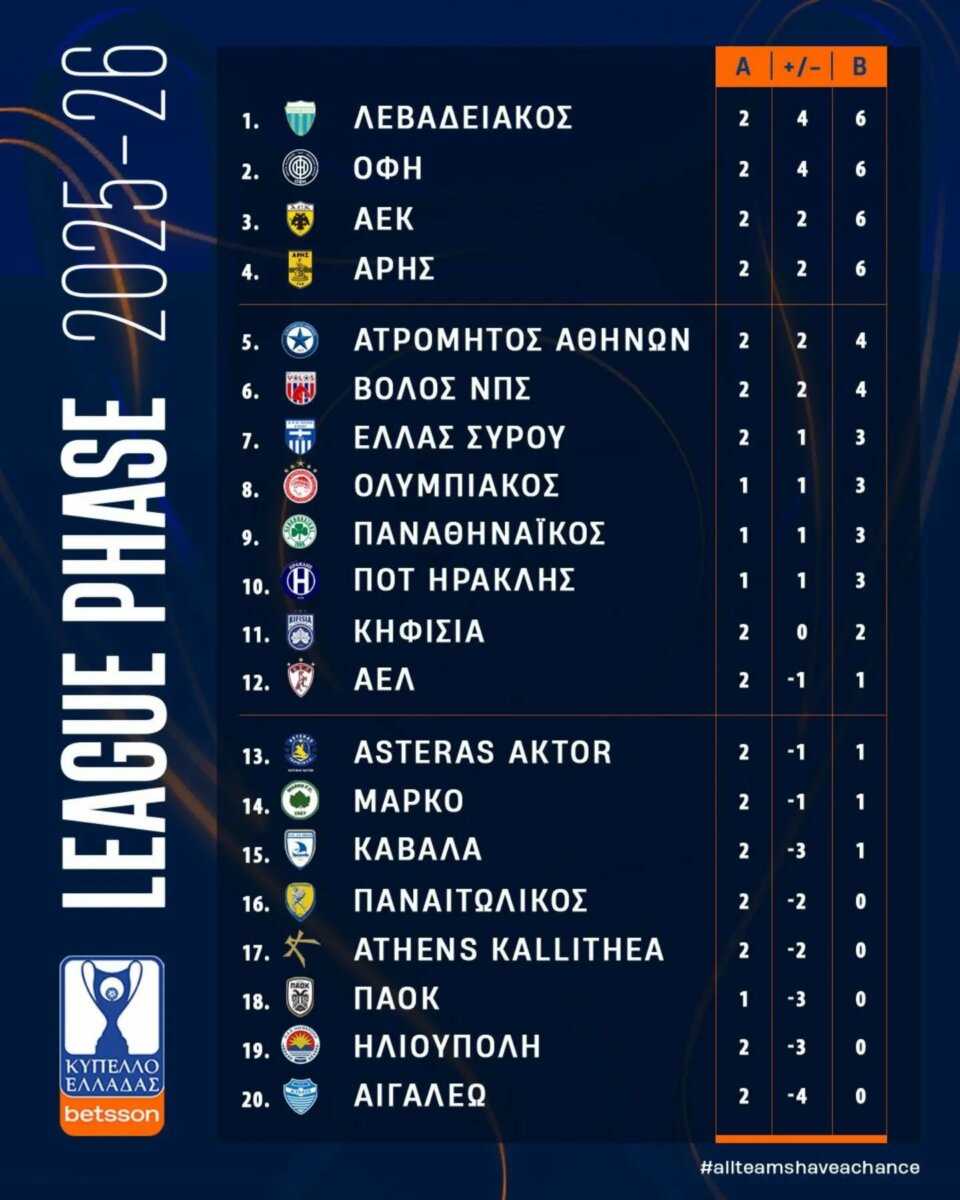 Με το παιχνίδι Π.Ο.Τ. Ηρακλής – Γ.Σ. Ηλιούπολης, που έγινε (25/9) στο γήπεδο του εθνικού σταδίου της Θεσσαλονίκης, το γνωστό μας “Καυτανζόγλειο” (φωτο πάνω) και στο οποίο η γηπεδούχος ομάδα επικράτησε με 1-0, ολοκληρώθηκε η 2η αγωνιστική της “League Phase” (καινοτομία), του “Κυπέλλου Ελλάδας Betsson” 2025-2026.