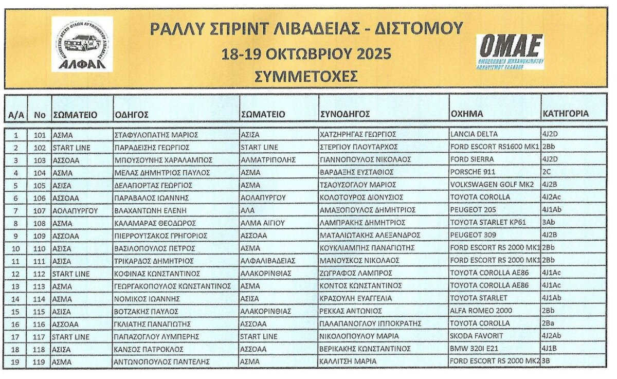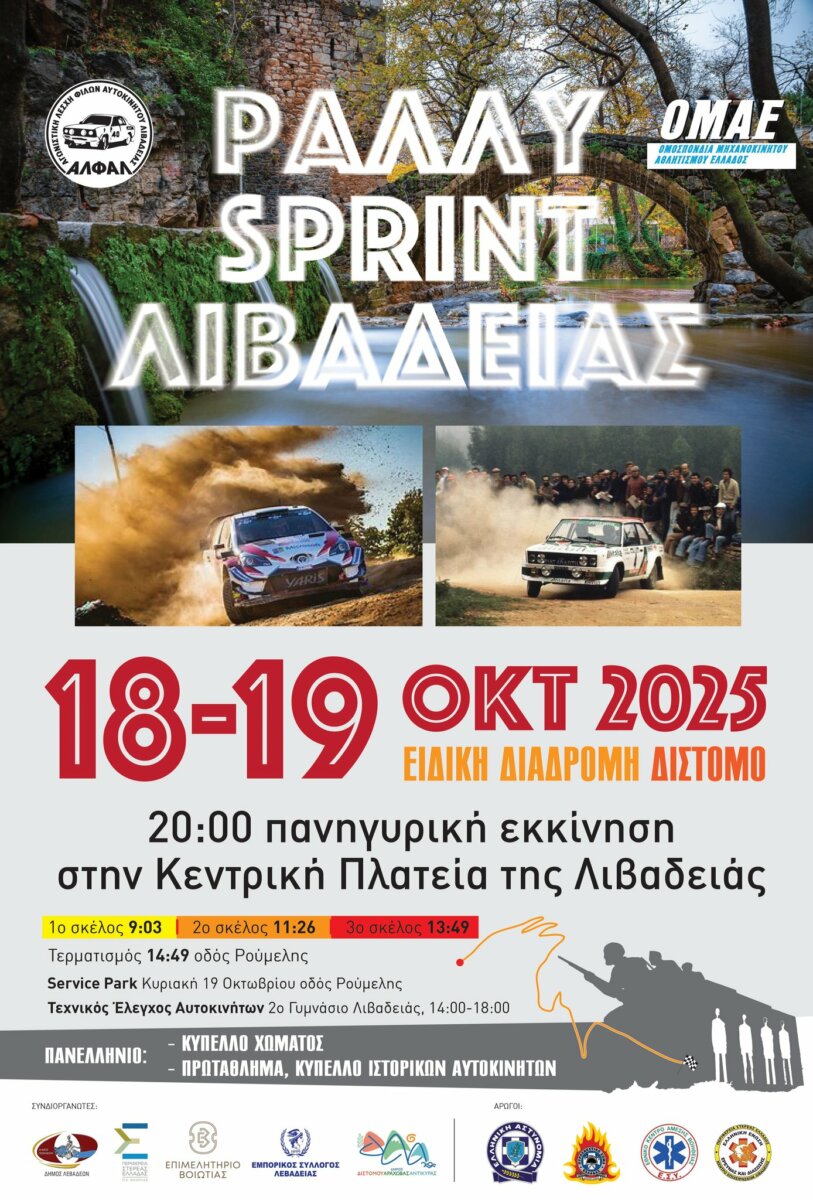 Στην… “τελική ευθεία” έχουν μπει άπαντες στις τάξεις της Αγωνιστικής Λέσχης Φίλων Αυτοκινήτου (Α.Λ.Φ.Α.Λ.) για την διεξαγωγή του αγώνα “Rally Sprint Λιβαδειάς 2025” που έχει οριστεί να διεξαχθεί το προσεχές σαββατοκύριακο, 18-19 Οκτωβρίου, στην “ακροπολική” ειδική διαδρομή, στο Δίστομο και ο οποίος προσμετρά στο πανελλήνιο κύπελλο ράλι χώματος (4ο γύρος) για το 2025, στο πανελλήνιο πρωτάθλημα αγώνων ράλι ιστορικών αυτοκινήτων και στο πανελλήνιο κύπελλο ράλι χώματος ιστορικών αυτοκινήτων!