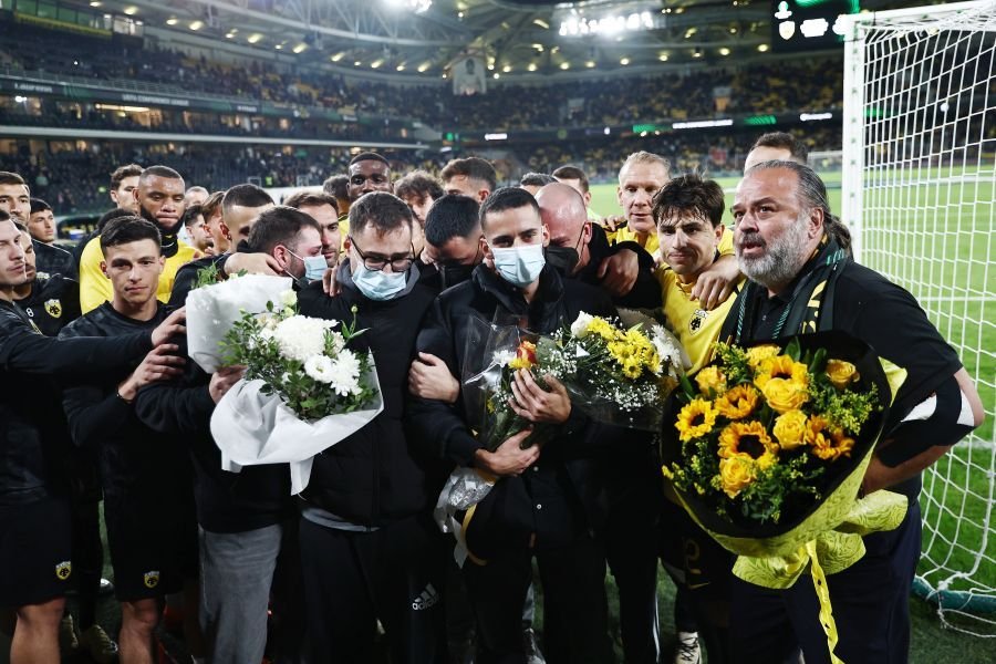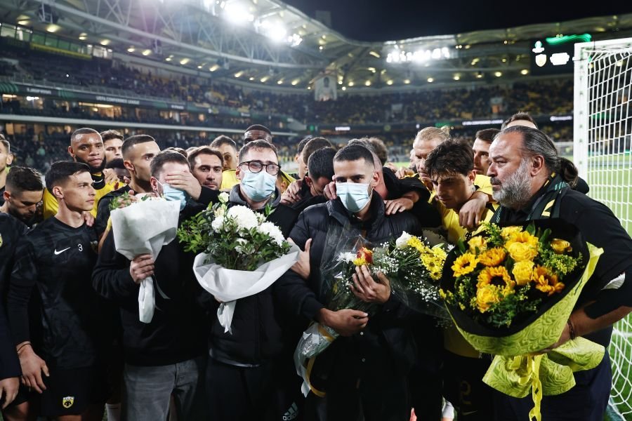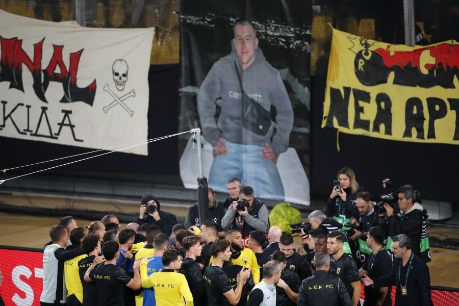 Την ίδια ώρα οι φίλαθλοι της ΑΕΚ τραγουδούσαν για τα “παιδιά εκεί ψηλά” με την συγκίνηση να είναι μεγάλη για την άδικη απώλεια του 20χρονου Μάριου.