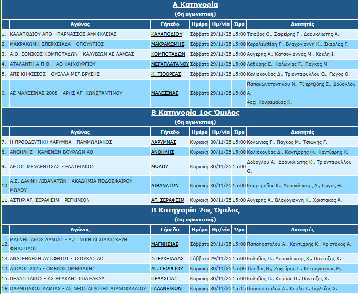 Η επιτροπή διαιτησίας της ΕΠΣ Φθιώτιδας ανακοίνωσε τους διαιτητές του Σαββατοκύριακου (29-30/11) σε Α’ και Β’ κατηγορία.