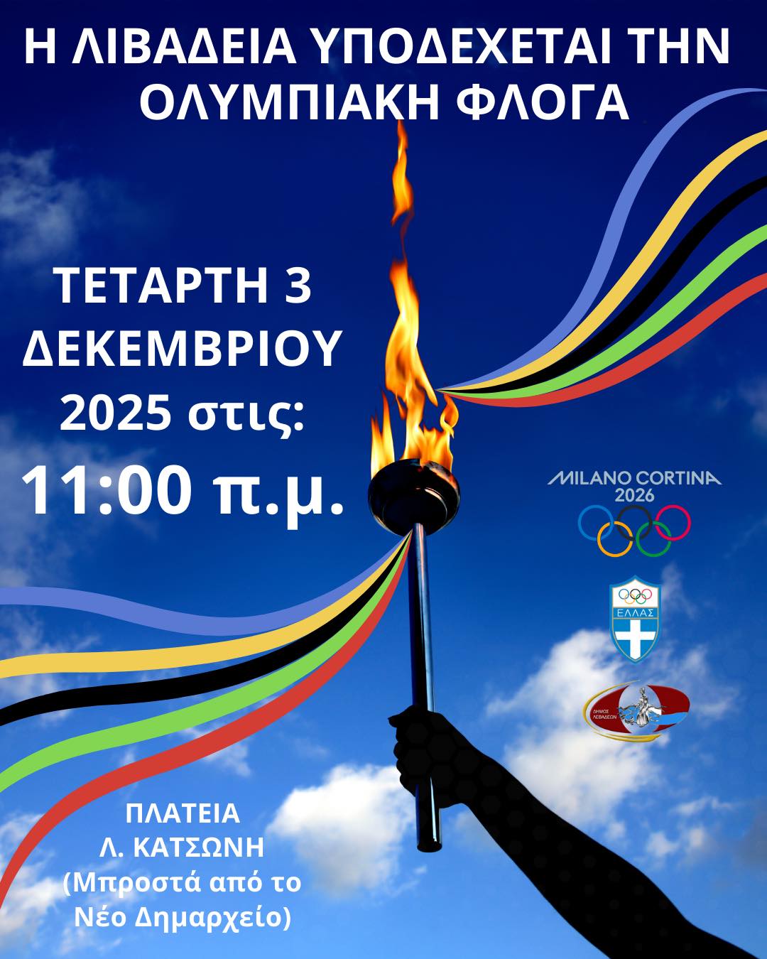 Την Τετάρτη 3/12 στις 11:00′ στην πλατεία “Λάμπρου Κατσώνη” η τελετή για την υποδοχή της Φλόγας για τους Χειμερινούς Ολυμπιακούς Αγώνες “Milano Cortina 2026”!