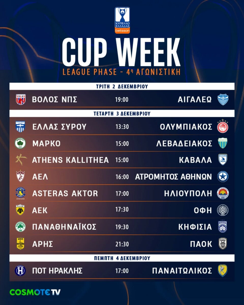 Με την διεξαγωγή (4/12) του αγώνα Π.Ο.Τ. Ηρακλής – Παναιτωλικός ολοκληρώθηκε (και) η 4η αγωνιστική της “League Phase” του “Κυπέλλου Ελλάδας Betsson” 2025-2026.