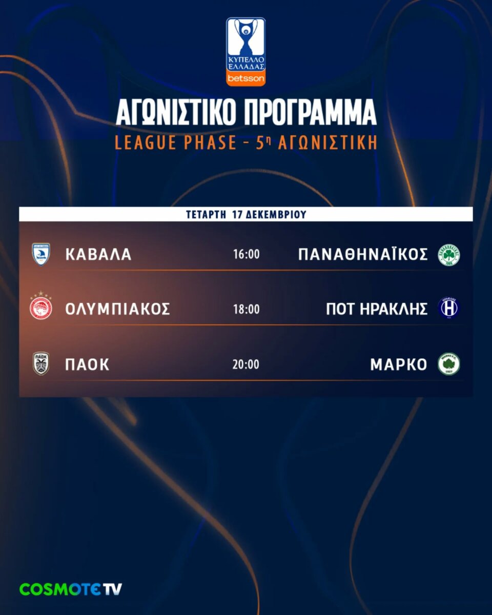 Από την ελληνική ποδοσφαιρική ομοσπονδία ανακοινώθηκε (5/12) το αναλυτικό πρόγραμμα των αγώνων της 5ης και τελευταίας αγωνιστικής της “League Phase” του “Κυπέλλου Ελλάδας Betsson” 2025-2026.