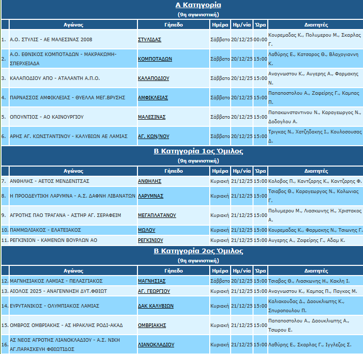 Η επιτροπή διαιτησίας της ΕΠΣ Φθιώτιδας ανακοίνωσε τους διαιτητές του Σαββατοκύριακου (20-21/12) σε Α’ και Β’ κατηγορία.