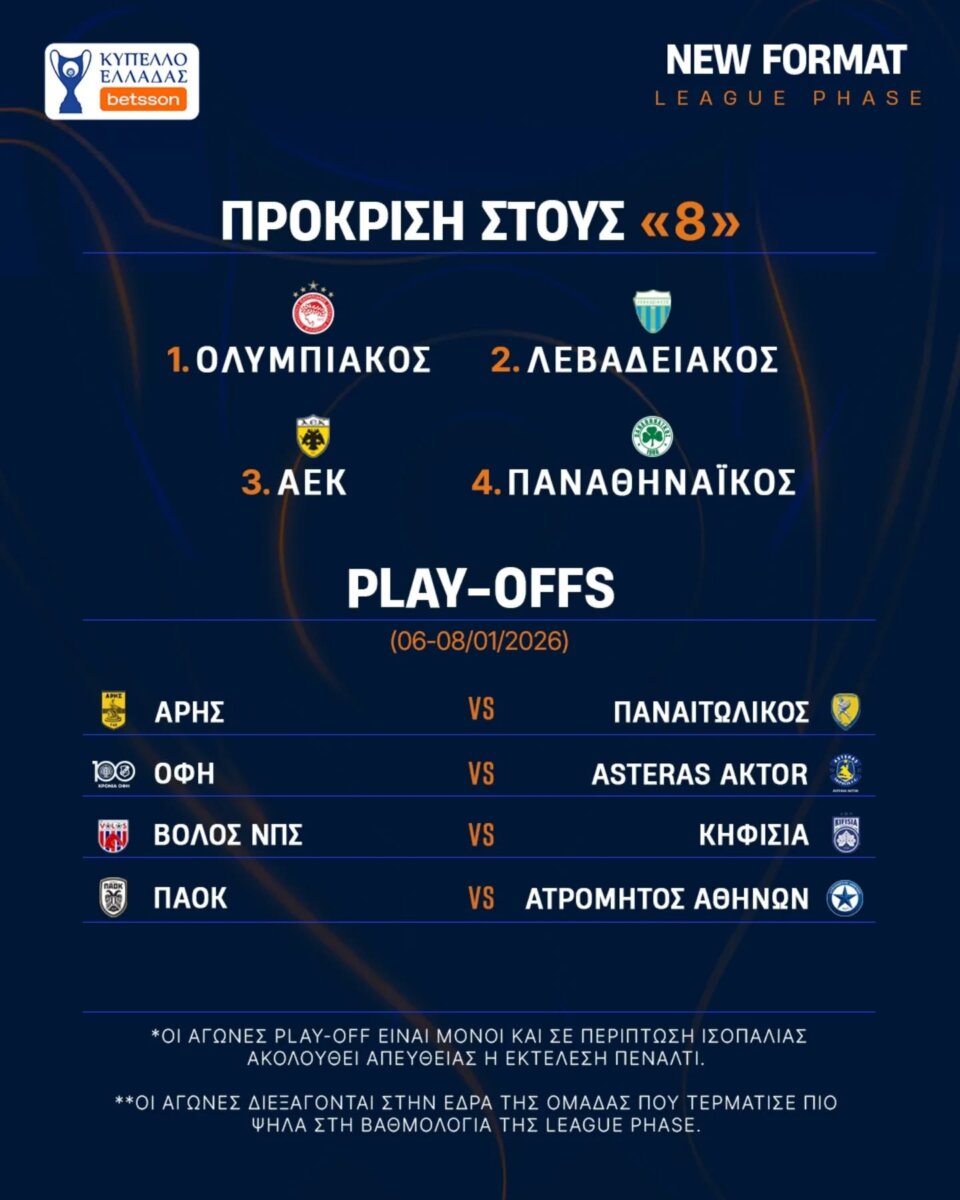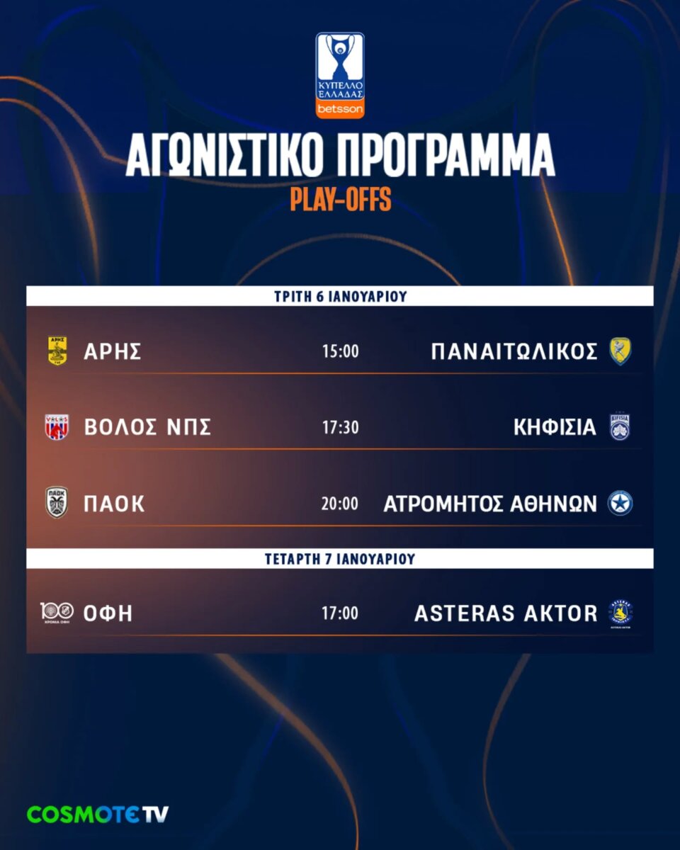 Από την ελληνική ποδοσφαιρική ομοσπονδία (Ε.Π.Ο.) ανακοινώθηκε (18/12) το αναλυτικό πρόγραμμα των αγώνων “play offs” του “Κυπέλλου Ελλάδας Betsson” 2025-2026.