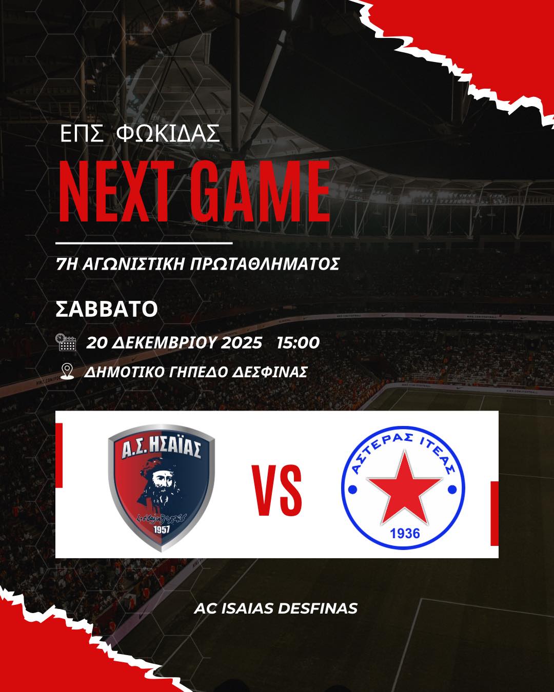 Ο αγώνας Ησαΐας Δεσφίνας – Αστέρας Ιτέας, που είχε οριστεί για το Σάββατο 20 Δεκεμβρίου 2025 στις 15:00 ως εξ αναβολής αναμέτρηση της 7ης αγωνιστικής του πρωταθλήματος ΕΠΣ Φωκίδας, ματαιώνεται οριστικά.