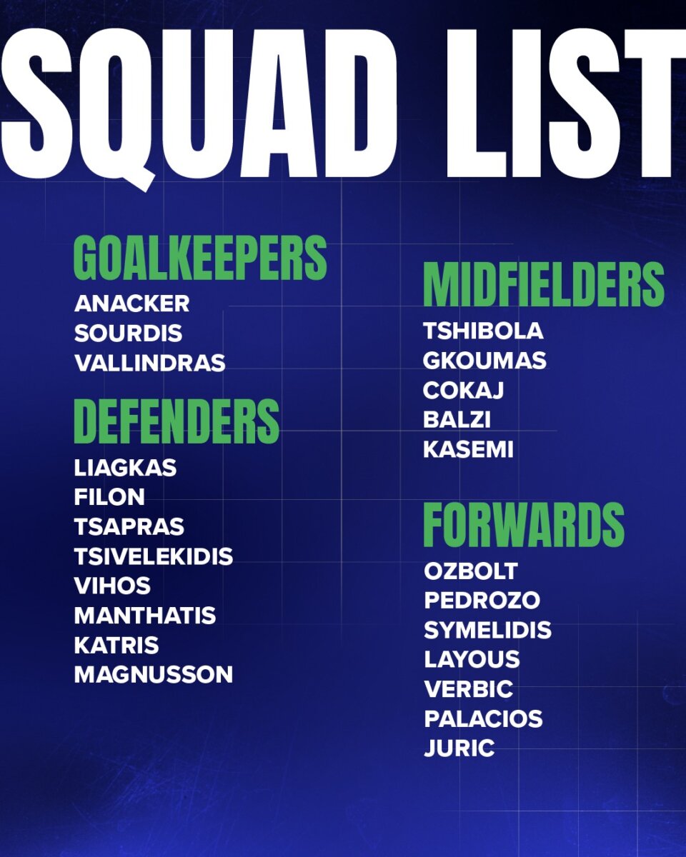 Οπως ανακοίνωσε η “πράσινη” Π.Α.Ε. την 23μελή “αποστολή” που ανακοίνωσε ο Νίκος Παπαδόπουλος, για το τελευταίο ματς της χρονιάς, απαρτίζουν οι: Άνακερ, Σουρδής, Βαλληνδράς, Λιάγκας, Φίλων, Τσάπρας, Βήχος, Μανθάτης, Κάτρης, Μάγκνουσον, Τσιβελεκίδης, Τσιμπόλα, Γκούμας, Τσοκάι, Κασέμι, Μπάλτσι, Όζμπολτ, Γιούριτς, Πεντρόζο, Βέρμπιτς, Συμελίδης, Λαγιούς και Παλάσιος.
