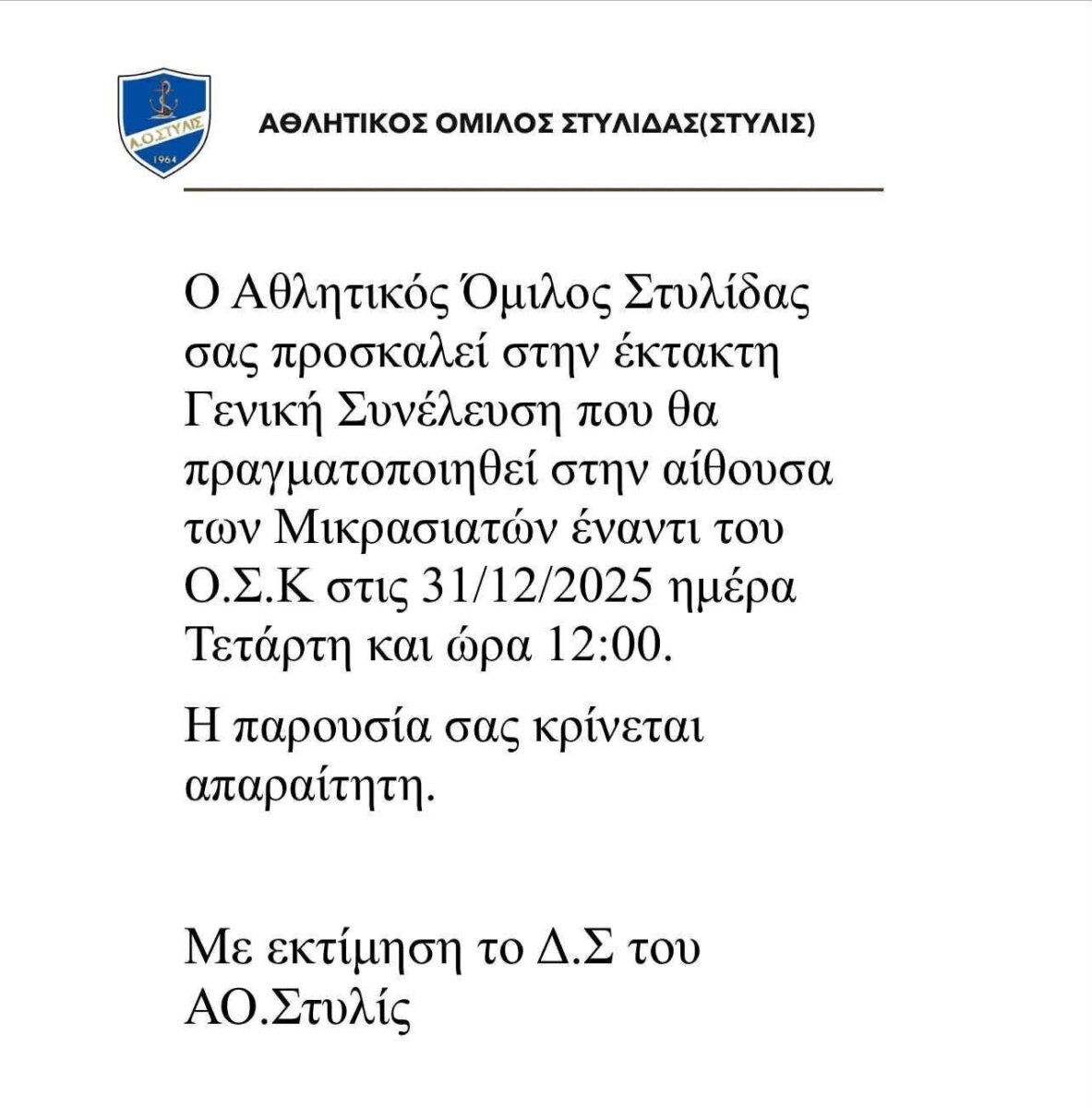 Έκτακτη γενική συνέλευση θα πραγματοποιήσει ο ΑΟ Στυλίδας την Τετάρτη 31 Ιανουαρίου.
