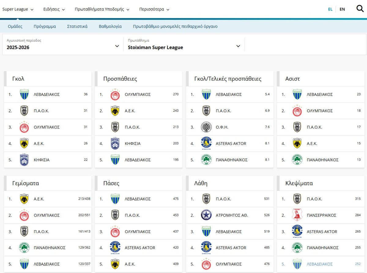 Ο Λεβαδειακός βρίσκεται στην 1η θέση και σε τρεις ακόμη κατηγορίες και συγκεκριμένα: