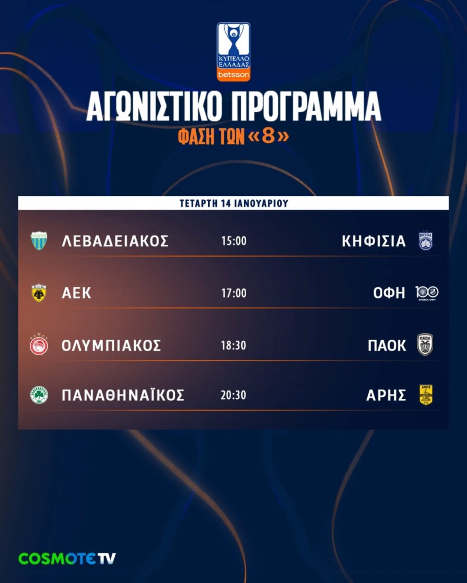 Θυμίζουμε οτι από τους αγώνες που έγιναν χθες (6/1) την πρόκριση στην επόμενη φάση πήραν η Α.Ε. Κηφισιάς (με το γκολ του Αμανι στο 81ο λεπτό επικράτησε με σκορ 1-0 της ομάδας του Ν.Π.Σ. “Βόλος” στο ματς που έγινε στο “Πανθεσσαλικό” στάδιο και θα τεθεί απέναντι στην ομάδα του Λεβαδειακού), ο Αρης (με τα γκολ του Μορόν στο 30′ και του Ράτσιτς στο 45′ επικράτησε με 2-0 της ομάδας του Παναιτωλικού στο ματς που έγινε στο “Κλεάνθης Βικελίδης” και θα αντιμετωπίσει εκτός έδρας την ομάδα του Παναθηναϊκού) και ο Π.Α.Ο.Κ. (που επικράτησε 5-4 στην διαδικασία των πέναλτι της ομάδας του Ατρόμητου Αθηνών στο παιχνίδι που έγινε στο γήπεδο της “Τούμπας” και στην κανονική διάρκεια έληξε ισόπαλο με σκορ 1-1).