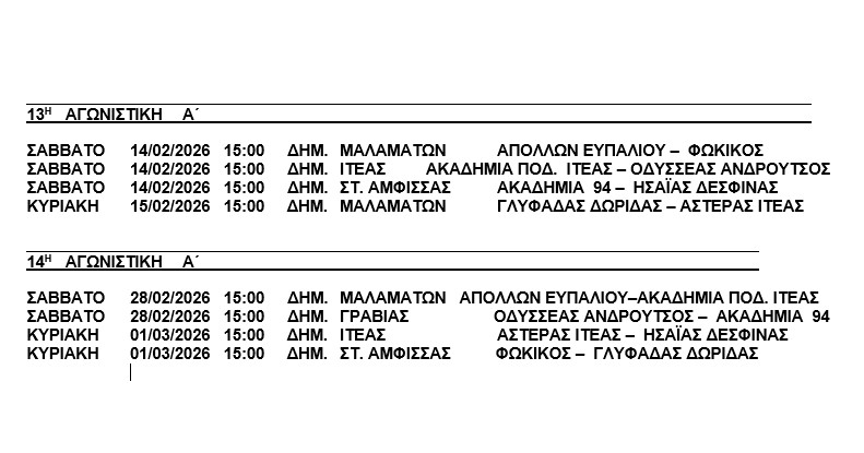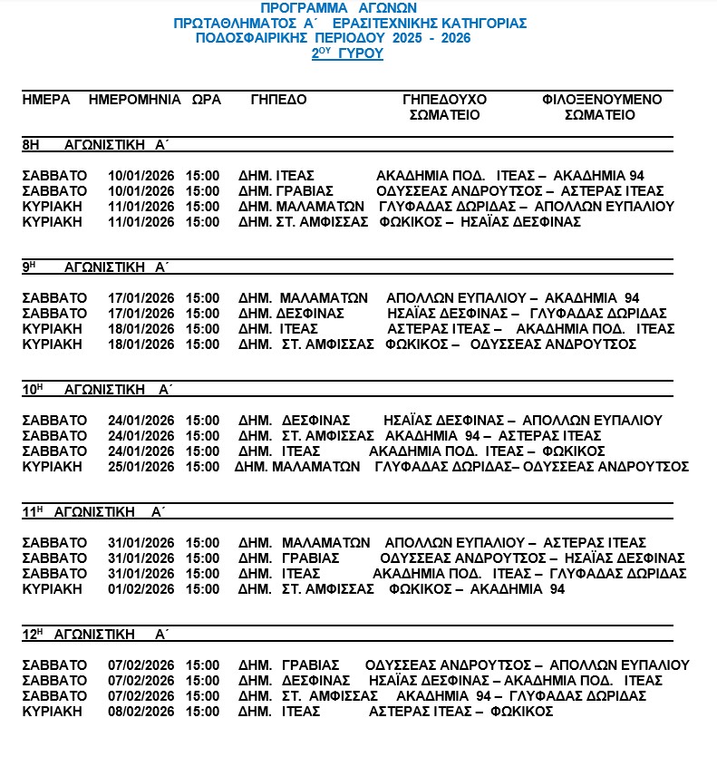 Μετά από την καθιερωμένη διακοπή και για τις γιορτές των Χριστουγέννων και της Πρωτοχρονιάς, συνεχίζεται το προσεχές σαββατοκύριακο, 10-11 Ιανουαρίου, το πρωτάθλημα της Α’ κατηγορίας που διοργανώνει η ενωση ποδοσφαιρικών σωματείων Φωκίδας και στη σεζόν 2025-2026.