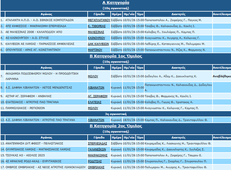 Η ΕΠΣ Φθιώτιδας ανακοίνωσε τους διαιτητές του Σαββατοκύριακου (10-11/1) σε Α’ και Β’ κατηγορία.