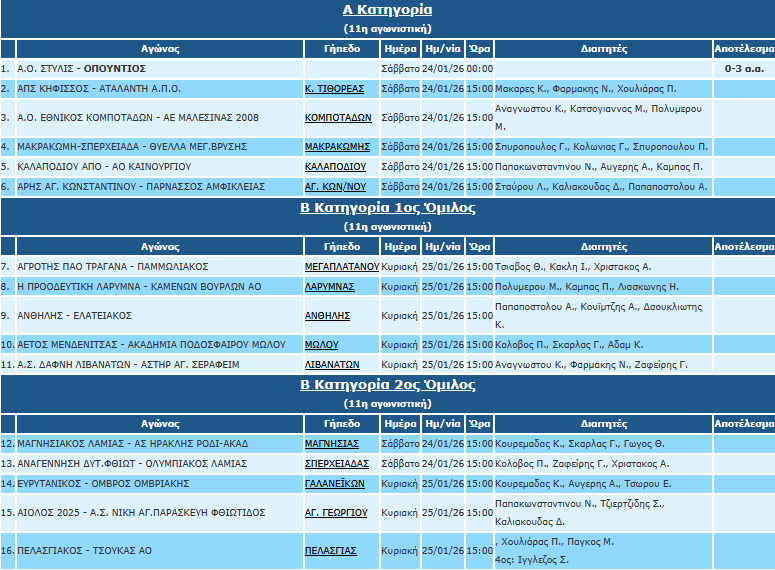 Η ΕΠΣ Φθιώτιδας ανακοίνωσε τους διαιτητές του Σαββατοκύριακου (24-25/1) σε Α’ και Β’ κατηγορία.