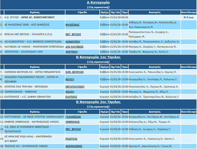 Η ΕΠΣ Φθιώτιδας ανακοίνωσε τους διαιτητές του Σαββατοκύριακου (31/1-1/2) σε Α’ και Β’ κατηγορία.