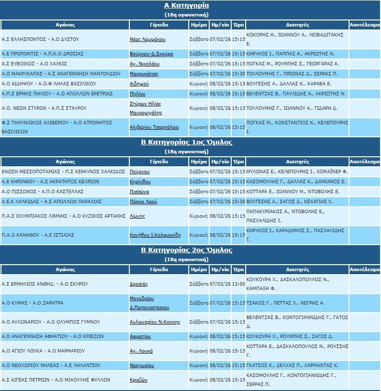 Με την 18η αγωνιστική συνεχίζεται το πρωτάθλημα της Α΄ ΕΠΣ Εύβοιας. Ο πρωτοπόρος Ταμυναϊκός φαίνεται ότι θα έχει εύκολο έργο απέναντι στον ουραγό της βαθμολογίας Ατρόμητο Βασιλικών. Σε ότι αφορά στην μάχη της παραμονής οι ομάδες που θέλουν να απομακρυνθούν από την επικίνδυνη ζώνη έχουν δύσκολες αναμετρήσεις.