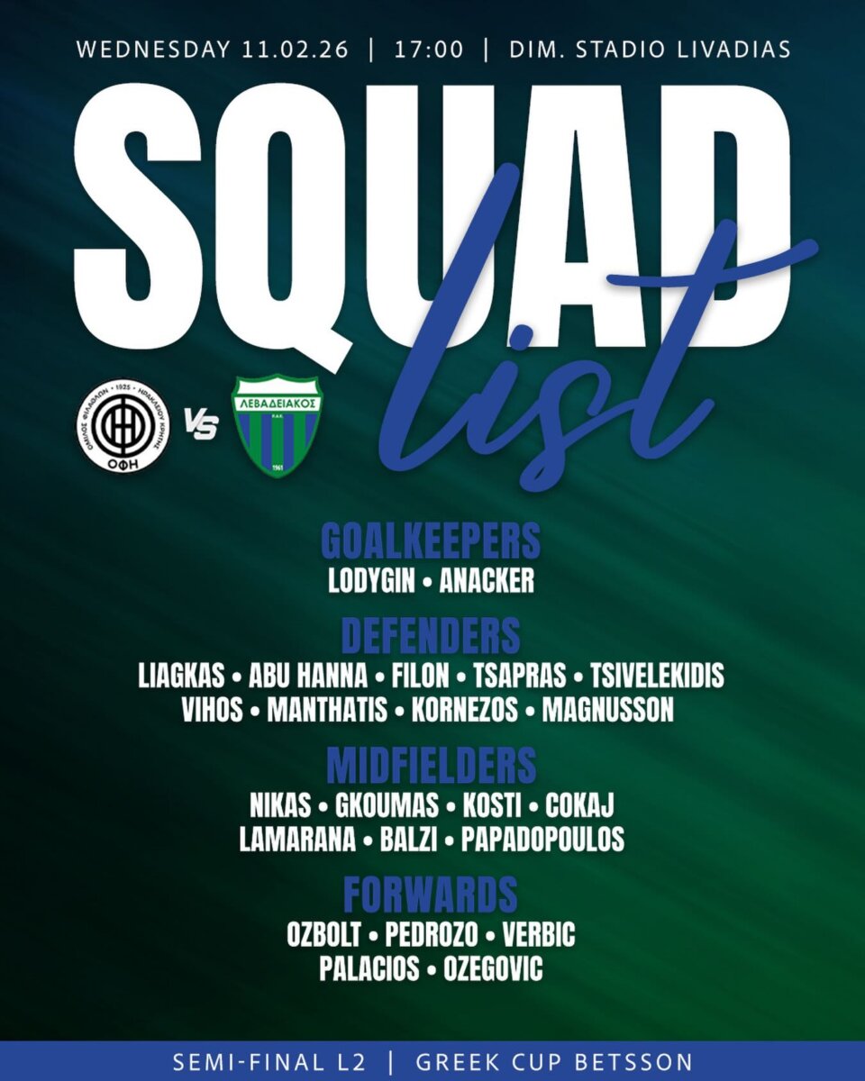 Με την προπόνηση που διεξήχθη στο προπονητικό κέντρο της Π.Α.Ε., στον Αγιο Σπυρίδωνα, ολοκληρώθηκε η “μίνι” προετοιμασία των παιχτών της ομάδας του Λεβαδειακού, για τον αυριανό (Τετάρτη, 11/2) αγώνα με αντίπαλο την ομάδα του Ο.Φ.Η., στο πλαίσιο της 2ης αγωνιστικής (“ρεβάνς”), της Ε’ φάσης (ημιτελικής – “4”), του Κυπέλλου Ελλάδας Betsson 2025-2026, που έχει οριστεί να διεξαχθεί στο γήπεδο του δημοτικού σταδίου της Λιβαδειάς “Λάμπρος Κατσώνης”, με την “σέντρα” να έχει οριστεί για τις 17:00′!