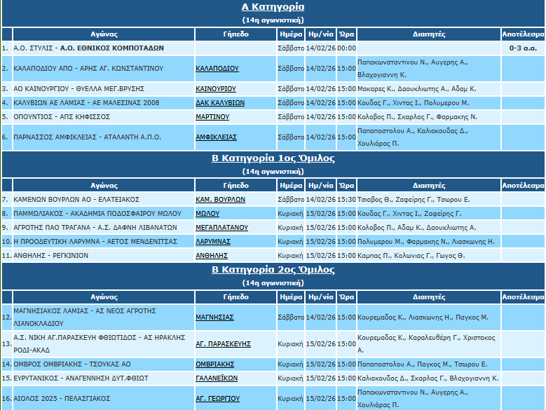 Η ΕΠΣ Φθιώτιδας αναοίνωσε τους διαιτητές του Σαββατοκύριακου (14-15/2) σε Α’ και Β’ κατηγορία.