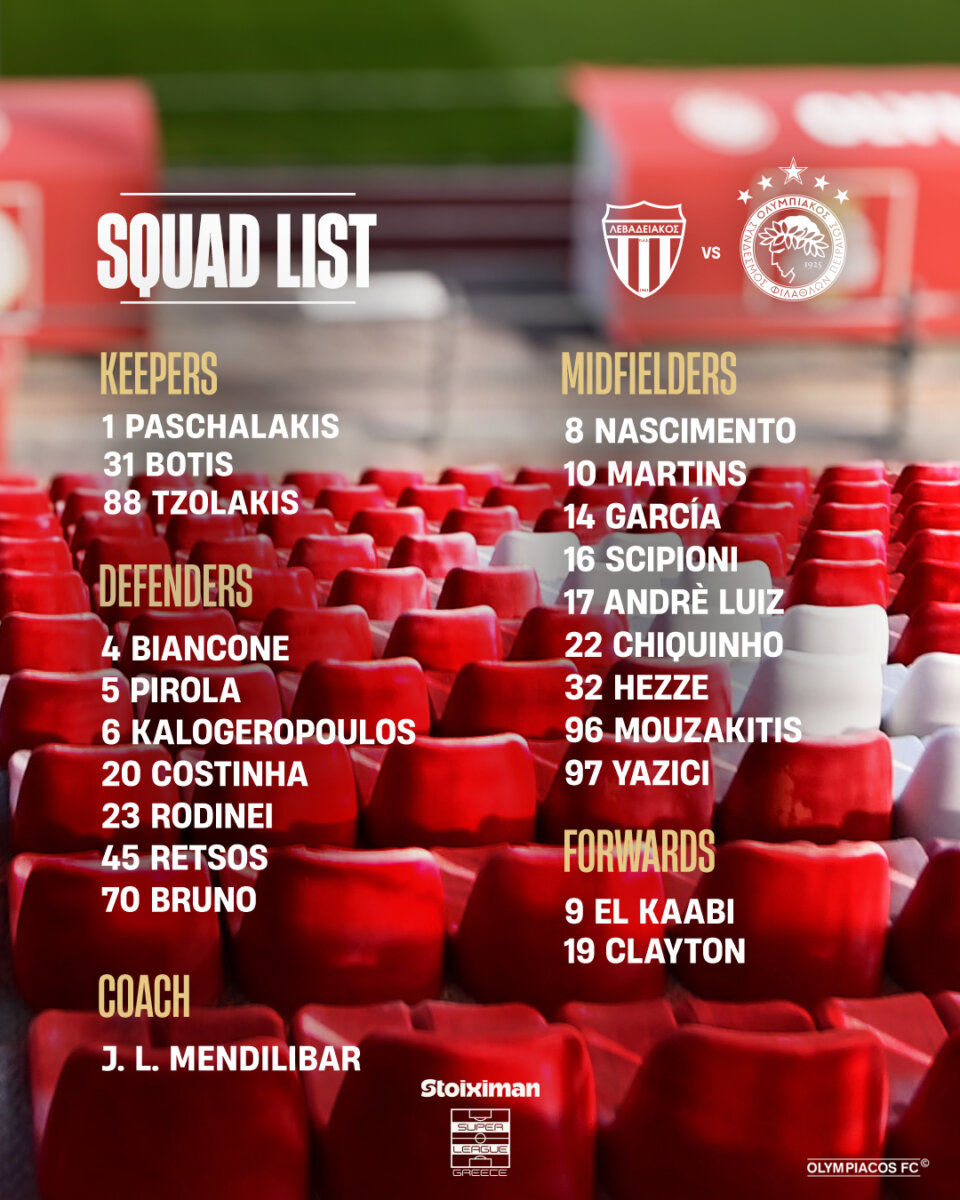 Οπως ανακοίνωσε η “ερυθρόλευκη” Π.Α.Ε. στην αποστολή συμπεριλήφθηκαν 21 ποδοσφαιριστές και αυτοί είναι οι: Μπιανκόν, Έσε, Τσικίνιο, Κοστίνια, Γκαρθία, Καλογερόπουλος, Μαρτίνς, Πασχαλάκης, Μουζακίτης, Νασιμέντο, Μπότης, Ελ Κααμπί, Ρέτσος, Σιπιόνι, Κλέιτον, Τζολάκης, Μπρούνο, Γιαζίτζι, Λουίς, Ροντινέι, Πιρόλα.