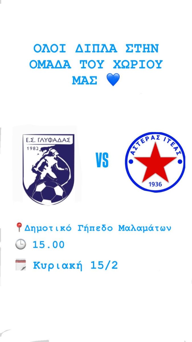 Το πρόγραμμα της αγωνιστικής συνεχίζεται και ολοκληρώνεται αύριο, Κυριακή, 15/2, με τον αγώνα: Ε.Σ. Γλυφάδας Δωρίδας – Α.Σ. “Αστέρας” Ιτέας (15:00′, δημοτικό γήπεδο των Μαλαμάτων).