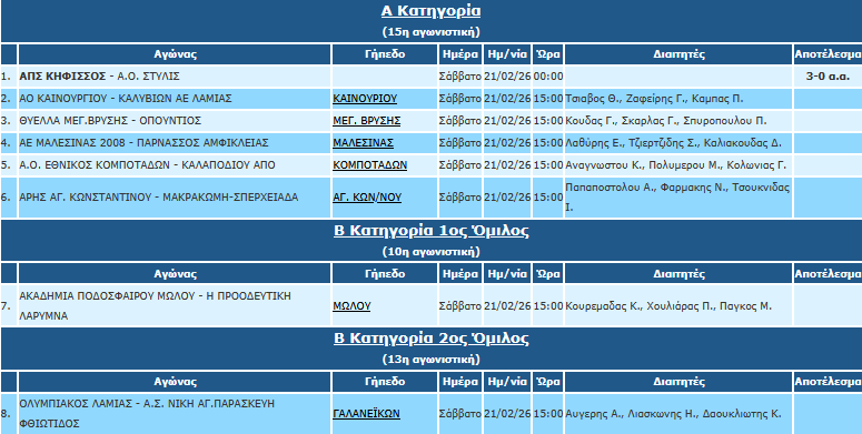 Η επιτροπή διαιτησίας της ΕΠΣ Φθιώτιδας ανακοίνωσε τους διαιτητές του Σαββάτου (21/2) σε Α’ και Β’ κατηγορία.