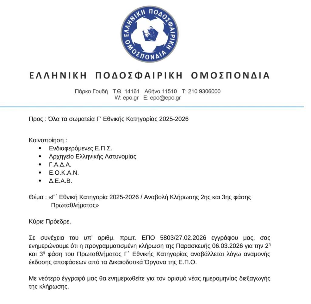 Σε αναβολή οδηγήθηκε η κλήρωση των play-offs και play-out της Γ’ Εθνικής που ήταν προγραμματισμένη για την Παρασκευή 6 Μαρτίου, όπως ενημέρωσε τα σωματεία η ΕΠΟ.