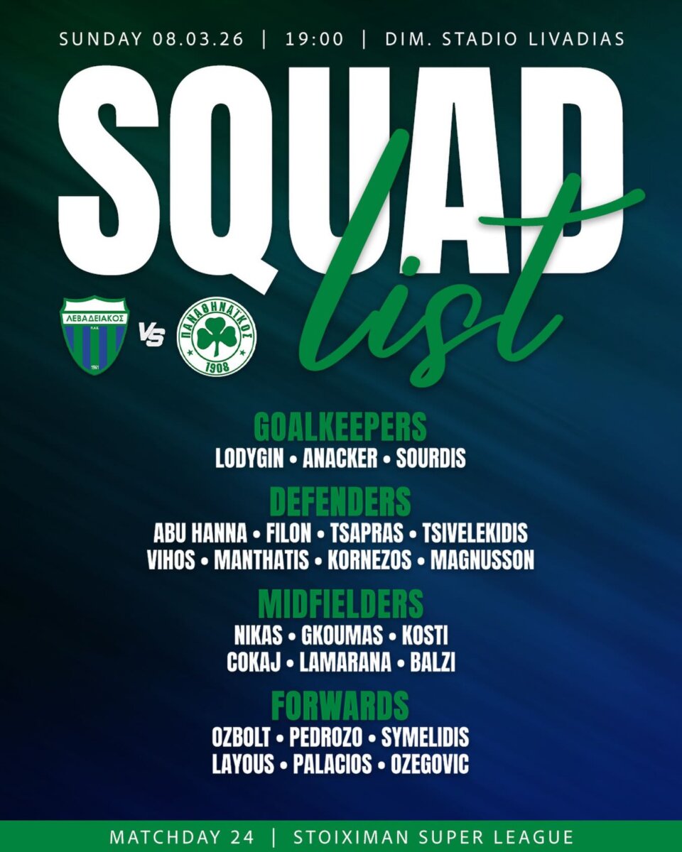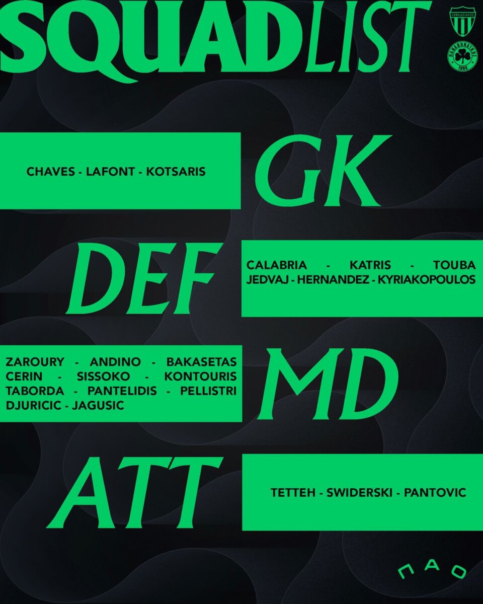 Οπως ανακοίνωσε η “πράσινη” Π.Α.Ε. ο 55χρονος, κιλκισιώτης, τεχνικός της ομάδας συμπεριέλαβε στην “αποστολή” 23 παίχτες, ανάμεσά τους 3 τερματοφύλακες.