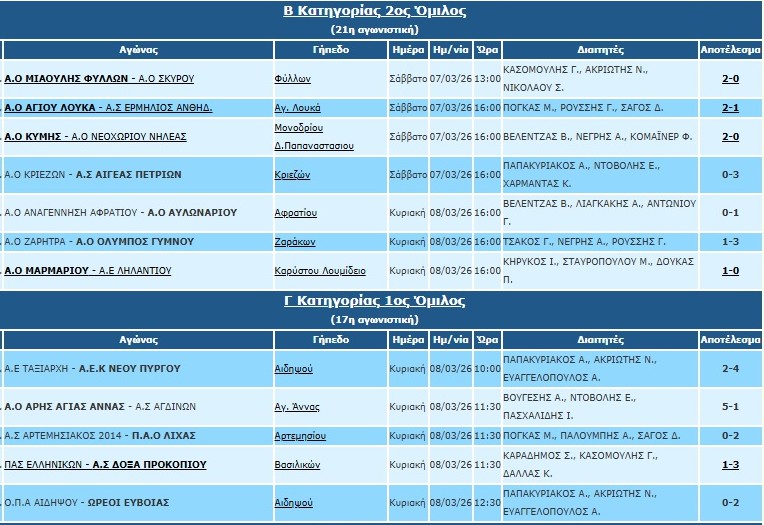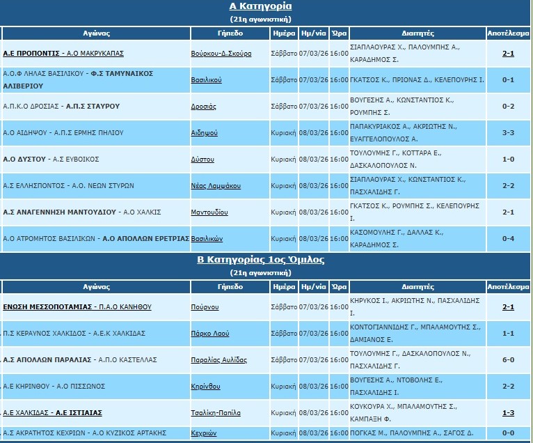 Ο Ευβοϊκός ηττήθηκε στον Δύστο και χάνει την επαφή του με τις υπόλοιπες ομάδες που βρίσκονται από πάνω του. Ο Απόλλων Ερέτριας παρότι έφυγε με διπλό από τα Βασιλικά ( Τόρα 2, Μώρος, Μπαλάκας) βρίσκεται ακόμα σε θέση υποβιβασμού καθώς η Αναγέννηση Μαντουδίου πήρε σπουδαία νίκη επί του ΑΟ Χαλκίς και παρέμεινε έναν βαθμό από την ζώνη.