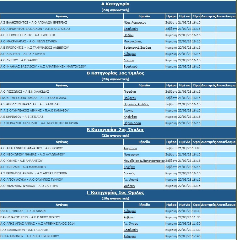 Στα υπόλοιπα παιχνίδια η Χαλκίδα ταξειδεύει στον Δύστο, η Μακρυκάπα με την ψυχολογία στα ύψη από την πρόσφατη πρόκριση στους “4” του κυπέλλου φιλοξενεί τον ΑΟ Ν. Στύρων, ενώ Αιδηψός και Σταυρός κοντράρονται στην Βόρεια Εύβοια με φόντο την είσοδο στην πρώτη 6αδα.