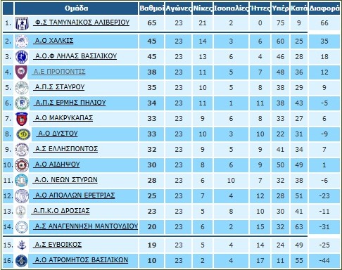Μια ανάσα πριν από την στέψη του πρωταθλητή βρίσκεται ο Ταμυναϊκός μετά το βαθμό της ισοπαλίας στο Βούρκο και την ήττα της Χαλκίδας στο Δύστο που έφερε τη διαφορά στους 20 βαθμούς επτά αγωνιστικές πριν το τέλος της διοργάνωσης.