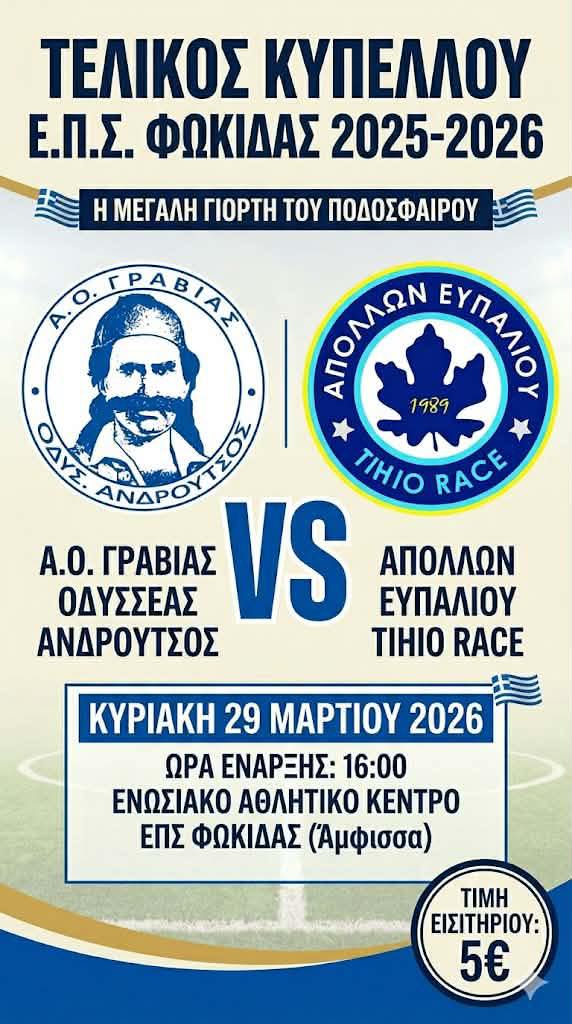 Την προσεχή Κυριακή, 29 Μαρτίου, στο γήπεδο της ενωσης ποδοσφαιρικών σωματείων Φωκίδας, στην Αμφισσα και με ώρα έναρξης στις 16:00′, ορίστηκε να διεξαχθεί ο “τελικός” αγώνας του κυπέλλου Φωκίδας, της σεζόν 2025-2026 “Η μεγάλη γιορτή του ποδοσφαίρου”!