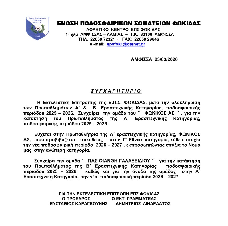 Εύχεται στην Πρωταθλήτρια της Α’ ερασιτεχνικής κατηγορίας, «ΦΩΚΙΚΟΣ ΑΣ», που προβιβάζεται – απευθείας – στην Γ’ Εθνική κατηγορία, κάθε επιτυχία την νέα ποδοσφαιρική περίοδο 2026 – 2027, εκπροσωπώντας επάξια το Νομό μας στην ανώτερη κατηγορία.