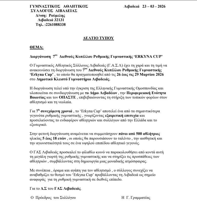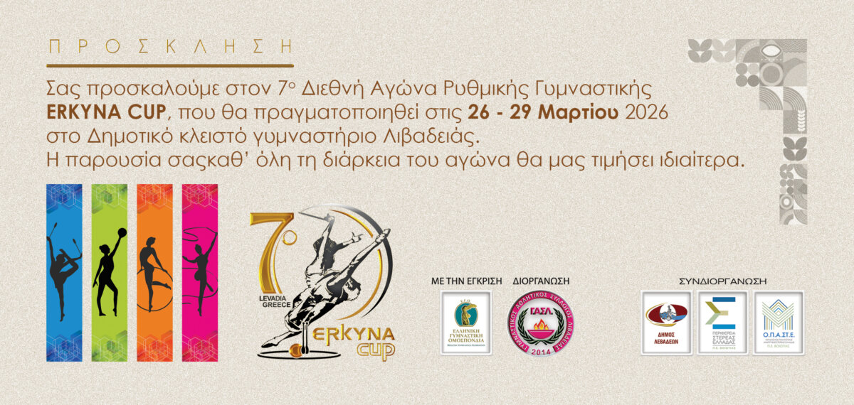 Στην… “τελική ευθεία” έχουν μπει, πλέον, οι διοργανωτές, οι άνθρωποι του Γυμναστικού Αθλητικού Συλλόγου Λιβαδειάς, για την πολύ μεγάλη διοργάνωση, το “Erkyna Cup”, τον Διεθνή Αγώνα Ρυθμικής Γυμναστικής που θα διεξαχθεί στο δημοτικό κλειστό γυμναστήριο της Λιβαδειάς, από την Πέμπτη 26, μέχρι και την Κυριακή, 29 Μαρτίου.