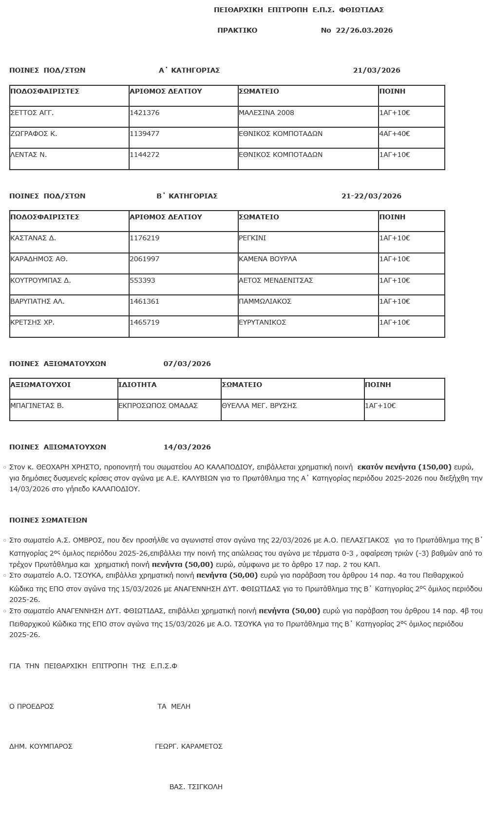 Η ΕΠΣ Φθιώτιδας ανακοίνωσε τις ποινές που επέβαλε η πειθαρχική επιτροπή κατά την τελευταία της συνεδρίαση (26/3).