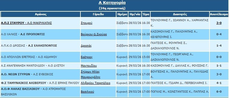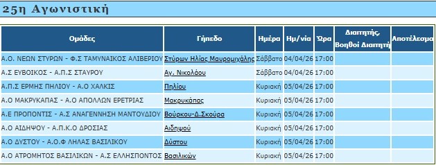 Στην ουρά του βαθμολογικού πίνακα, εκτός από τον Ατρόμητο Βασιλικών που ήδη έχει αποχαιρετίσει την κατηγορία, η κατάσταση έγινε διιαίτερα δύσκολη και για τον Ευβοϊκό που ηττήθηκε από τον ΑΟ Ν. Στύρων. Η ομάδα του Αγ. Νικολάου θα πρέπει να κάνει υπέρβαση τις επόμενες αγωνιστικές για να διεκδικήσει την παραμονή της.