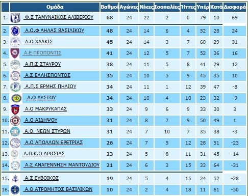 Η Αναγέννηση Μαντουδίου δεν κατάφερε να εκμεταλλευθεί την ήττα της Δροσιάς και παρέμεινε στην 14η θέση. Ισοπαλία και για τον Απόλλωνα Ερέτριας που διατήρησε την διαφορά της από την επικίνδυνη ζώνη, έχασε όμως την ευκαιρία να την αυξήσει.