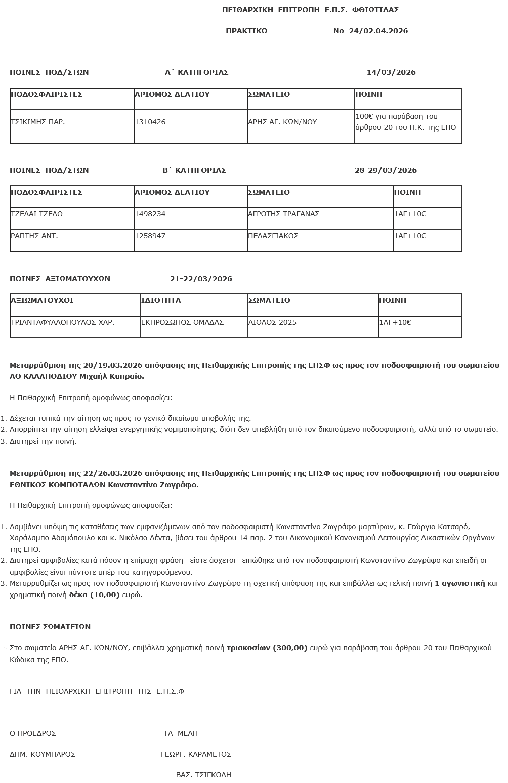 Η ΕΠΣ Φθιώτιδας ανακοίνωσε τις ποινές που επέβαλε η πειθαρχική επιτροπή κατά την τελευταία της συνεδρίαση (2/4).