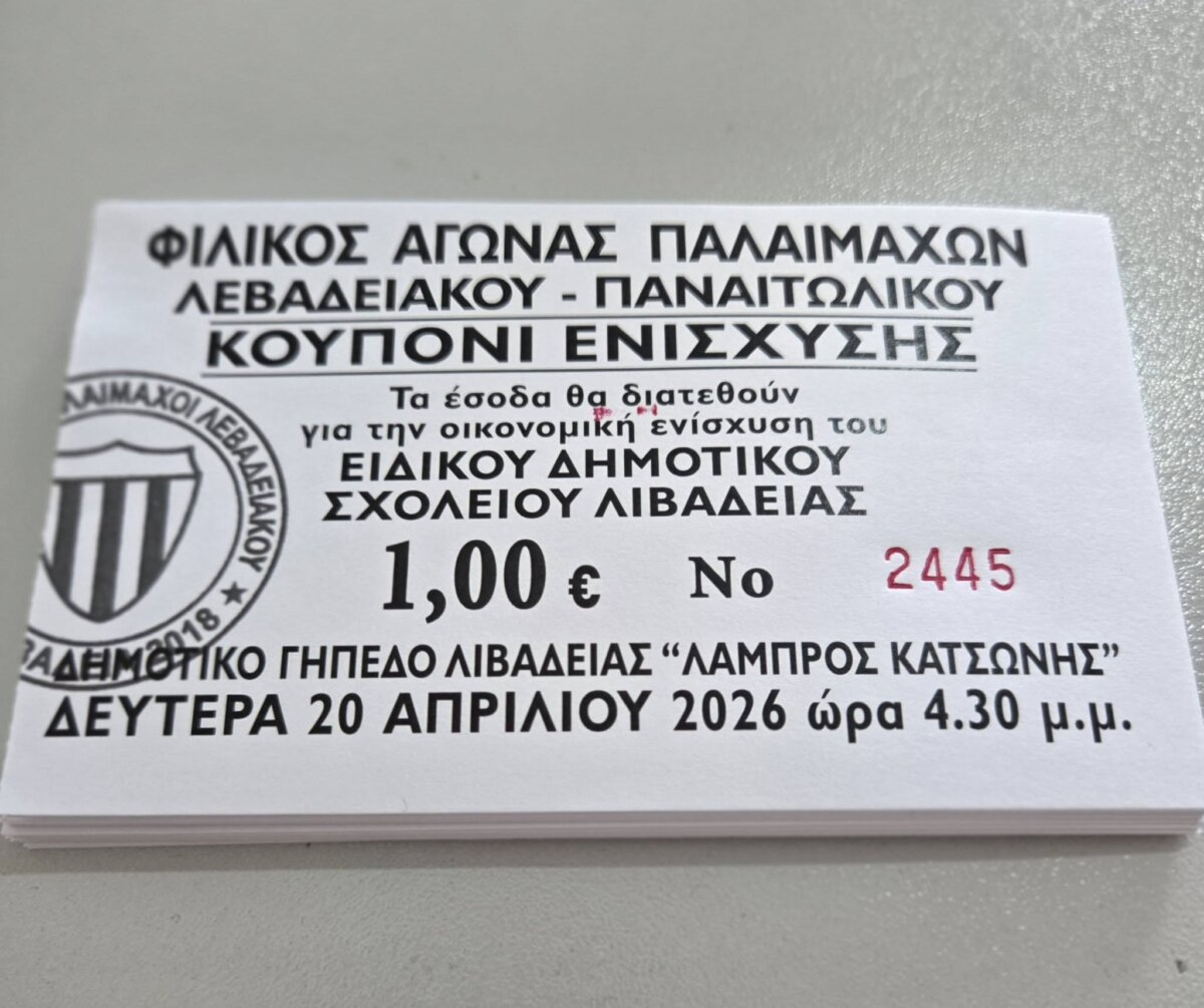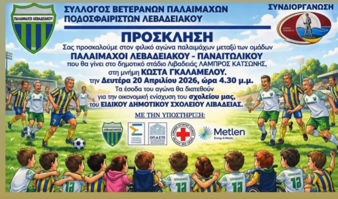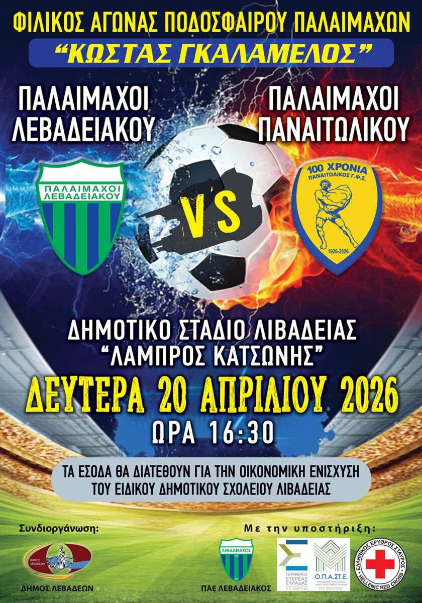 Την Δευτέρα 20 Απριλίου 2026, οι Παλαίμαχοι του Λεβαδειακού και του Παναιτωλικού δίνουν ραντεβού στο Δημοτικό Στάδιο Λιβαδειάς «Λάμπρος Κατσώνης».