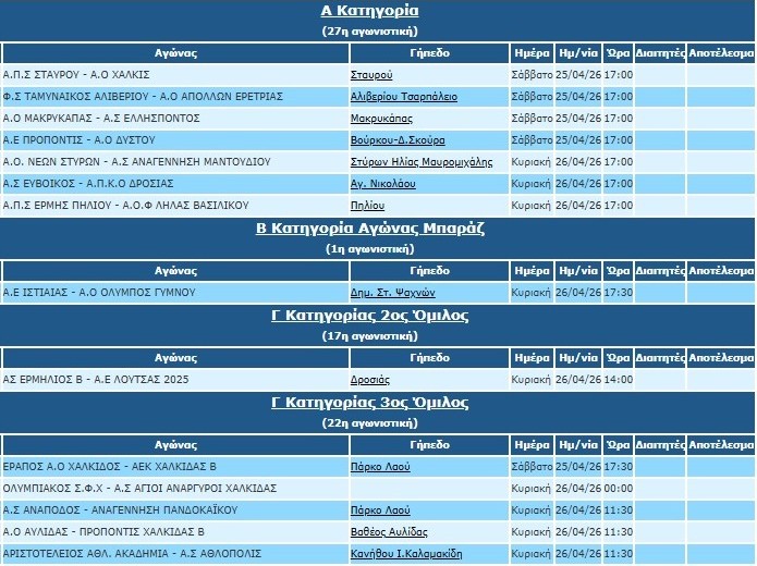 Τέσσερις αγωνιστικές πριν την ολοκλήρωση του πρωταθλήματος της Α΄ Εύβοιας και εκτός από την κορυφή η κατάσταση φαίνεται ότι διαμορφώνεται και στην ουρά του βαθμολογικού πίνακα. Η 27η αγωνιστική είναι καθοριστική για την εξέλιξη της διοργάνωσης καθώς περιλαμβάνει αναμετρήσεις κομβικές για τις ομάδες που βρίσκονται στην ζώνη και προσπαθούν να αποφύγουν τον υποβιβασμό στην παρακάτω κατηγορία.
