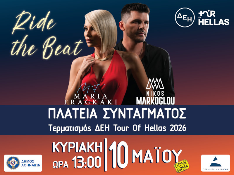 Από τις 12:00, το Ride the Beat μετατρέπει το Σύνταγμα σε σημείο συνάντησης για όλη την πόλη, με τους Stavento, την Ήβη Αδάμου, την Evangelia, την Kira May Cry και DJ sets με τον Νίκο Μάρκογλου και τη Μαρία Φραγκάκη, σε ένα εντυπωσιακό φινάλε για τον ΔΕΗ Tour of Hellas 2026.